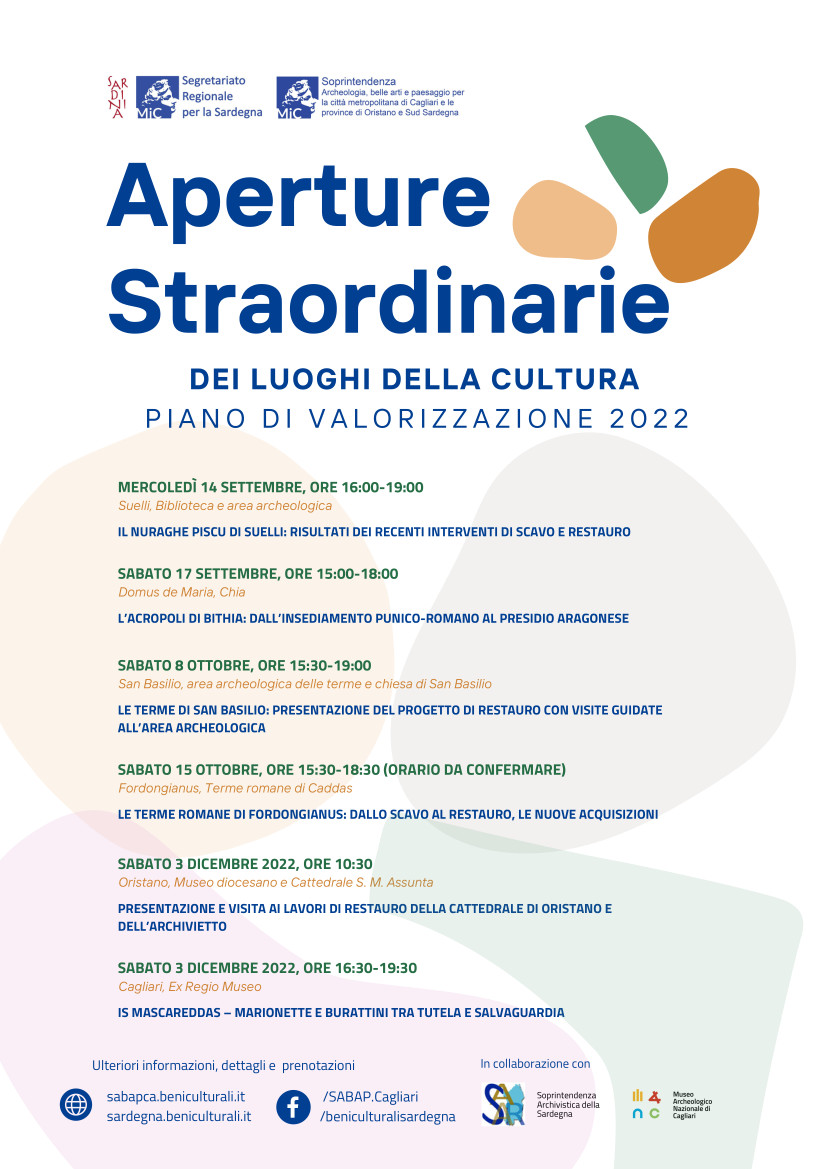 Il programma elaborato dai due Istituti, in collaborazione con altri uffici del MiC, enti territoriali e soggetti che operano nel settore dei beni culturali, propone un ricco calendario di eventi che, a partire dal 14 settembre fino al 3 dicembre 2022, costituiranno l’occasione per presentare al pubblico progetti, cantieri e lavori, in corso e recentemente conclusi, relativi a beni archeologici, architettonici, storico-artistici, demoetnoantropologici e al paesaggio. In via del tutto eccezionale sarà possibile visitare siti archeologici e monumenti di solito non accessibili al pubblico. Da segnalare, tra le tante iniziative, l’ultima rappresentazione teatrale dei burattini della collezione de Is Mascareddas, di recente sottoposta a tutela.